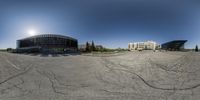 An empty parking lot in Toronto, surrounded by high-rise buildings. The city's urban design is visible in the straight, symmetrical layout of the lot and surrounding infrastructure. Clear sky and sunlight illuminate the scene.