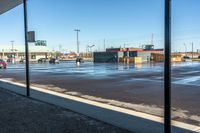 This is an image of a commercial parking lot in Toronto, Ontario, Canada. The winter scene shows cars parked on the wet asphalt surface, with a clear sky above. The sidewalk and outdoor area are visible, indicating a day with no precipitation. The focus is on the storefronts and shops that line the parking lot, representing the shopping scene in Toronto. This photo captures a typical winter day in a commercial area of Ontario.