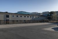 A sunny day in Toronto, Canada. The modern architecture of the city's business district is contrasted against the low-rise residential suburbs. The clear sky reflects off the windows of office buildings and warehouses. Asphalt roads and parking lots are lined with trees and vegetation.