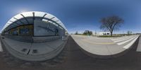 A fisheye lens shot captures the urban landscape of Toronto, Canada. The modern architecture of the buildings contrasts with the brownstone houses and tree-lined streets. Clear skies provide a stunning backdrop to the bustling city.