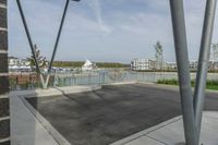 This image shows a parking lot in Toronto, Canada. The foreground features two metal poles with a square structure underneath, forming a unique urban design element. The surrounding area includes buildings, trees, and road surfaces covered in asphalt. In the background, the city skyline is visible, with clouds overhead and the coastal harbor and ocean in the distance. This photo represents a typical day in Toronto, with its combination of urban and natural elements. It also showcases the city's coastal location and its connection to water.