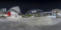 A 360-view of Toronto's urban landscape, captured from an elevated ramp. The modern architecture and high-rise buildings create a symmetrical and vibrant cityscape. The clear sky and artificial lights illuminate the streets, highlighting the bustling business district.