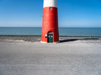 A serene coastal landscape in Holland, Netherlands. Clear sky and azure waters provide a calming backdrop to a towering lighthouse. The cylindrical building stands against a picturesque horizon.
