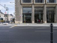 Welcome to Berlin, Germany. Explore the city's modern architecture and bustling city life. An empty street next to a building with large windows and a sign that reads 'No Parking'. Discover the urban design of Friedrichstraße.