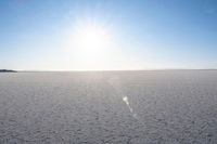 A tranquil winter day in California, with clear skies and a calm ocean. The sandy desert landscape contrasts with the open space and off-road tracks. The horizon meets the serene waves of the salt lake.