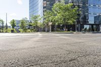 A view of a modern architecture office building in Toronto, Canada, located in a bustling business district. Surrounding the building are tree-lined roads, asphalt streets, and a clear sky. This metropolitan area is known for its urban infrastructure and vibrant neighborhoods.