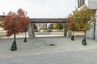 a tree lined walkway between two concrete statues and two buildings with red leaves on it