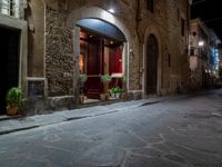A cozy Tuscan cafe glowing with warm light on a dark night. The old brick building is adorned with potted planters, creating an inviting atmosphere. Step into this charming European restaurant in Florence's garden-like setting.