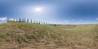 A panoramic view of a lone field in Tuscany, Italy. The rugged landscape showcases the beauty of the European countryside. Lush green grass and trees contrast against the clear sky. A serene natural environment.