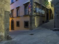 A charming alley-way in Tuscany, Italy. Classic architecture and colorful facades line the narrow street. The empty road invites a peaceful bike ride. Discover hidden storefronts, restaurants, and gardens in this European town.