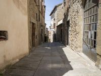 A charming scene in Tuscany, Italy. Small cobbled street flanked by stone houses and walls. Classic architecture and stone buildings create a picturesque village. A perfect day to explore this historic neighborhood.