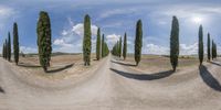 A scenic view of a desert road in Tuscany, Italy, surrounded by hills, fields, and tall trees. The fisheye lens captures the landscape, highlighting the lush vegetation and clear sky. A serene and picturesque setting in Europe.
