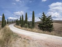 A scenic dirt road winding through the rugged landscape of Tuscany, Italy. The road is surrounded by lush vegetation, tall lodgepole pines, and vibrant gardens. Clear skies and fluffy clouds add to the natural beauty of this rural European wilderness.