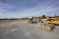 An unfinished construction site in Johnson City, Tennessee. Rugged terrain and open space provide a straight road surface for vehicles. Heavy machinery stands ready for further construction. A view from above captures the scene.