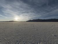 a lone skiboarder is seen walking through the desert under the setting sun with tracks left on the snow