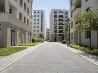 This stock photo features a walkway leading through two high rise apartment buildings in an urban setting outside the city of Berlin, Germany. The buildings showcase modern architecture and offer a glimpse into city life in a residential area. The clear sky above and the well-maintained road surface with cobble stones add to the urban design of the surroundings. The image captures the blend of nature and urbanization with vegetation, grass, and windows overlooking the city. This photo is perfect for illustrating urban lifestyle, architecture, and residential living in Berlin, Germany.