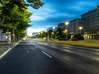 A classic European city scene at twilight or dawn. An empty street with a car passing a stop light. The motion blur of the car creates light streaks. The architecture features classic and urban elements.