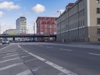 This stock photo showcases the urban architecture of Berlin, Germany. The image features an intersection with a bridge and cars going over it, with another highway in the background. The city's classic architecture can be seen in the buildings lining the road. The clear sky and fluffy clouds create a picturesque backdrop for this urban scene. The asphalt road, windows, and infrastructure highlight the city's urban design. This image captures the essence of Berlin's vibrant and dynamic urban environment in broad daylight.