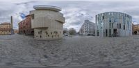 A wide open brick road in Berlin's business district, surrounded by classic architecture and modern office buildings. The clear sky casts hard shadows on the cobblestone surface, creating a dramatic urban landscape. A unique blend of history and urban design.