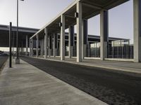 This stock photo showcases a modern office building with metal columns and a sleek facade. The building is located in a bustling city, as evidenced by the many cars parked at the roadside and the open walkway. The urban design of the area is highlighted by the presence of street lights and the composite material used for the road surface. In the background, a bridge adds to the architectural beauty of the scene. The combination of architectural elements and urban infrastructure creates a stunning composite of lines, shades, and tints.