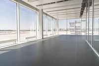 An elegant interior design of a modern office building in a bustling business district. The spacious room features sleek architecture, concrete flooring, and floor-to-ceiling windows. A perfect representation of urban real estate.