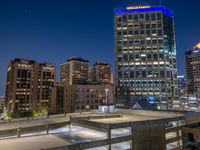 A night view of Salt Lake City's urban business district. Modern architecture is illuminated by artificial light, creating a captivating cityscape. Concrete streets and office buildings line the roads, while parking garages and rooftop spaces add to the urban design.