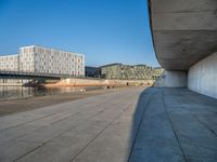 A stunning urban architecture scene capturing the break of day in Berlin, Germany. The photograph showcases the modern architecture and concrete walls of the city, with a clear sky overhead. A river flows through the city, creating a beautiful reflection of the buildings and bridges. The image also captures the hard shadows cast by the morning sunlight, creating a dynamic contrast on the surface of the walls. This urban design masterpiece is a perfect representation of the vibrant city life in Europe's capital.
