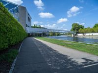 A modern cityscape in Berlin, Germany. Urban design features modern architecture and the iconic river flowing through the city. Greenery and grass surfaces contrast with the hard shadows cast by the buildings. A vibrant and dynamic scene.
