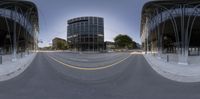 A bustling city street lined with modern buildings and street lamps. In the background, a striking glass building stands tall, reflecting the vibrant city life. This urban landscape showcases the blend of architecture and design in a metropolitan area.