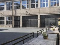 This image showcases the side of an industrial building in Berlin, Germany. The building has a beautiful facade with windows and a wooden walkway with a guard rail. In the foreground, there is a bench and a set of stairs. A man can be seen walking by, adding a sense of city life to the scene. The urban design of the neighborhood and the cobblestone courtyard give this property a unique charm. This picture captures the essence of classic architecture and the vibrant city atmosphere of Berlin in Europe. It is a perfect representation of urban life and is ideal for real estate or urban design projects.