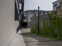 Porto's urban architecture blends modern design with historic cobblestone streets under a clear sky. A daytime view showcasing the entryways and driveways of Portugal's charming city.