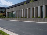 a building with a logo painted on the side near a street that has a sidewalk next to it