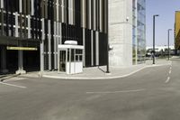 A bus stop at an empty street intersection in Toronto's Financial District. Tall, modern office buildings with sleek facades surround the public space. Clear skies highlight the city's urban design and architecture.