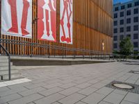 Modern office building in Berlin's business district. Urban architecture against a clear sky. Wood wall adds a touch of warmth to the city's modern design. A glimpse of Europe's urban landscape.