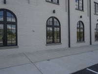 A modern office building with a glass facade and symmetrical design stands in an urban art district. The clear sky reflects on the glass, creating a stunning visual. Classic architecture meets modern design in this sunny city scene.