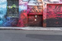 This vibrant stock photo captures the essence of city life in Los Angeles. The image features a graffiti mural on a pink wall in an urban art district. Streets lined with suburban houses can be seen in the background. The road surface, painted in blue, adds an artistic touch to the scene, while the light and shadows create interesting patterns. This photo perfectly showcases the intersection of urban design, street art, and city life in Los Angeles.