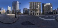 Urban landscape in Atlanta, Georgia. Classic and modern architecture create a unique city profile. Hard shadows on asphalt roads blend with storefronts and restaurants. A bustling city life under clear skies.