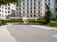 A view of Berlin's modern architecture and vibrant city life. The clear sky highlights the architectural beauty of the residential and high-rise buildings. Cobblestone roads and green vegetation add to the charm of this urban European city.