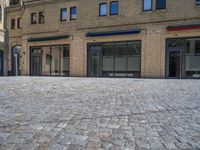 the sidewalk is paved with stones and has a bench in front of it, with no people inside