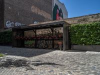 Urban Berlin courtyard with classic European architecture. Cobblestone streets and brick walls contrast with clear skies and hard shadows. Residential area blending city life with open spaces.