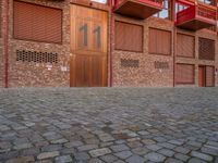 Urban Berlin at dawn, showcasing modern architecture and brick walls. Cobblestone roads lead through residential areas with courtyard depots. European city life seen in the design of storerooms and warehouses.
