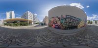 A vibrant urban scene in Berlin, Germany. Cobblestone road leads to a graffiti-covered wall. Clear sky casts hard shadows on the city's urban design. A straight road invites to eat out at a trendy restaurant.