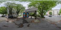 a photo of an asphalt road with a colorful, public bus stop on the side