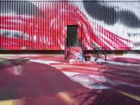 This stock photo captures the vibrant urban life of Berlin, Germany. The image showcases a red wall adorned with black and white graffiti art, creating a striking contrast against the modern architecture in the background. The city's dynamic energy is further emphasized by the presence of vehicles on the asphalt road and the clear blue sky overhead. The red wall is located near a park bench with wheels, adding an unexpected touch to the scene. This captivating image represents the intersection of art, technology, and urban design in Berlin's bustling city streets.