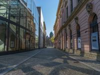 Urban scene in Berlin, showcasing modern architecture and hard shadows cast on glass walls. Cobblestone alleyways lead to open spaces in the city, merging tradition with contemporary design.
