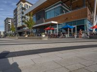 This photo captures a scene outside a waterfront restaurant with glass walls and a wooden structure. People are seen sitting at tables, enjoying the coastal view and the outdoor dining experience. The architecture of the building combines modern design with natural elements, such as trees and the ocean. The restaurant is located on a road with smooth asphalt and curbs, providing easy access to the public space. This image showcases the perfect day out where you can eat out and relax while enjoying the beautiful scenery and the sound of ocean waves.