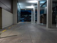 A long shot of an empty walkway in a large urban building. The metropolitan area is visible through the glass buildings. Coastal lights illuminate the straight road leading to the water.