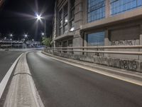 A view of a tall building with windows lining its surface. Street lights illuminate the road surface made of smooth asphalt. The road stretches out like a thoroughfare, its tar glistening under the light.