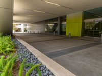 A modern office building in the heart of California's bustling city. The concrete surface of the walkway is illuminated by the sun, contrasting with the surrounding small rocks and shrubs. A perfect example of urban design in the USA.