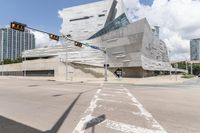 A clear sky overlooks the modern architecture of downtown Dallas. Office buildings and museums line the city streets, creating a vibrant cityscape. The bustling business district is connected by asphalt roads and curbs. A perfect day to explore this urban neighborhood.